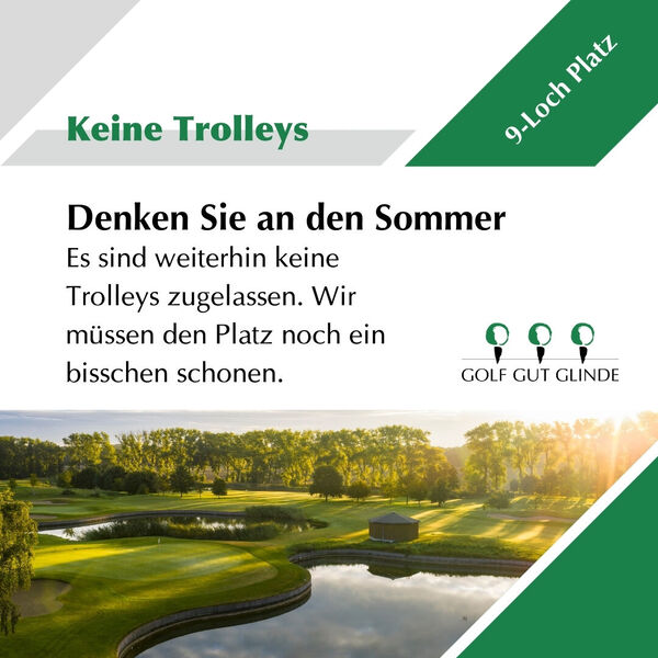 muss der Trolley noch in der Winterpause bleiben. Die Platzverhältnisse lassen es zwar zu, dass Gespielt werden kann, allerdings müssen wir den PLatz weiter schonen und können die Trolleys nicht freigeben. Wer jetzt Rücksicht nimmt, hat im Sommer einen viel schöneren Golfplatz. Und das wollen wir doch schließlich Alle.