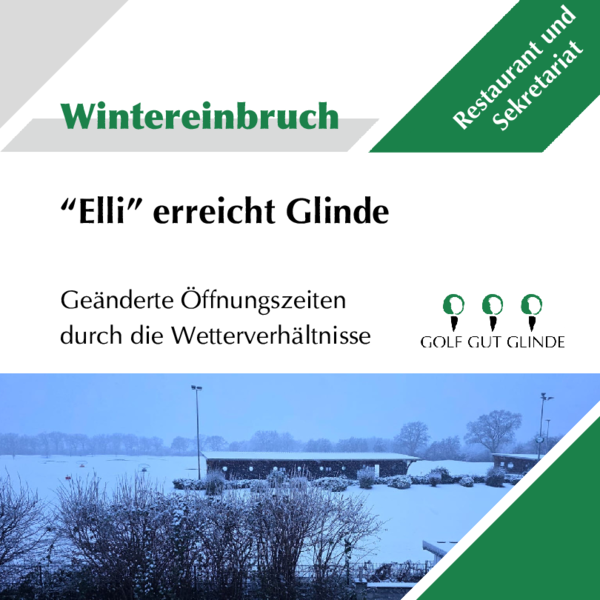 Aufgrund der Wetterverhältnisse wird am morgigen Freitag (09.01.2026) sowohl das Sekretariat, der Pro Shop, als auch das Restaurant des Golf Gut Glinde geschlossen bleiben. Am 10.01.2026 sind wir aber wie gewohnt für Sie da und freuen uns Sie zahlreich auf unserem Neujahrsempfangbegrüßen zu dürfen.