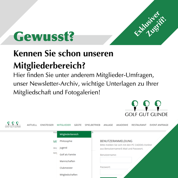 Wussten Sie schon, dass unser Mitgliederbereich auf der Golf Gut Glinde Website Ihnen eine Fülle an exklusiven Informationen und Ressourcen bietet? Ob Sie einen Blick auf die Fotogalerien unserer Turniere werfen, wichtige Unterlagen einsehen oder das Archiv unserer Newsletter durchstöbern möchten – hier werden Sie fündig.
