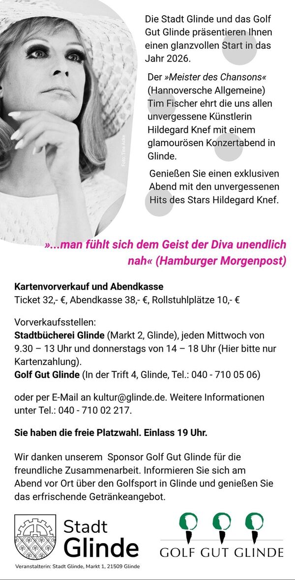 Tickets sind dort jeden Mittwoch von 9:30 – 13 Uhr und Donnerstag von 14 – 18 Uhr in der Stadtbücherei Glinde erhältlich (nur Kartenzahlung möglich).