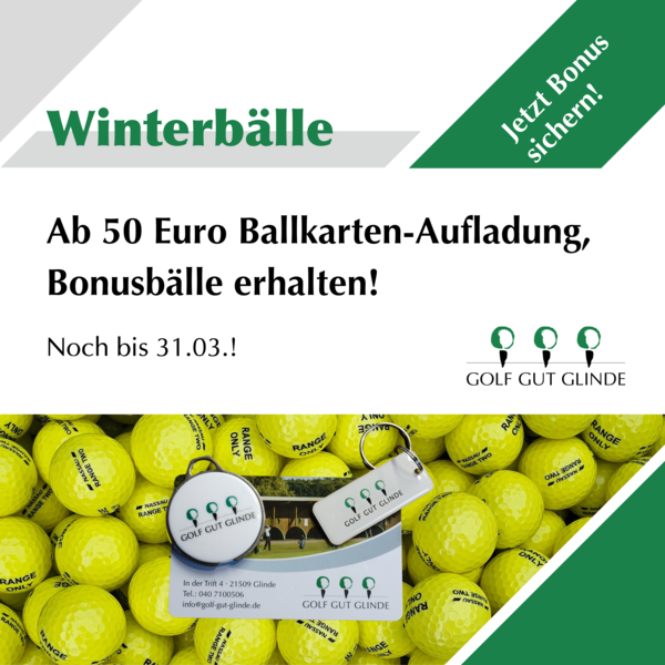 Verpassen Sie nicht die Chance auf unser Sonderangebot! Wenn Sie Ihre Ballkarte ab 50 Euro aufladen, profitieren Sie bis zum 31. März von gratis Rangebällen – sowohl für Mitglieder als auch für Gäste. Verbessern Sie Ihr Golfspiel und genießen Sie jede Runde auf dem Platz!