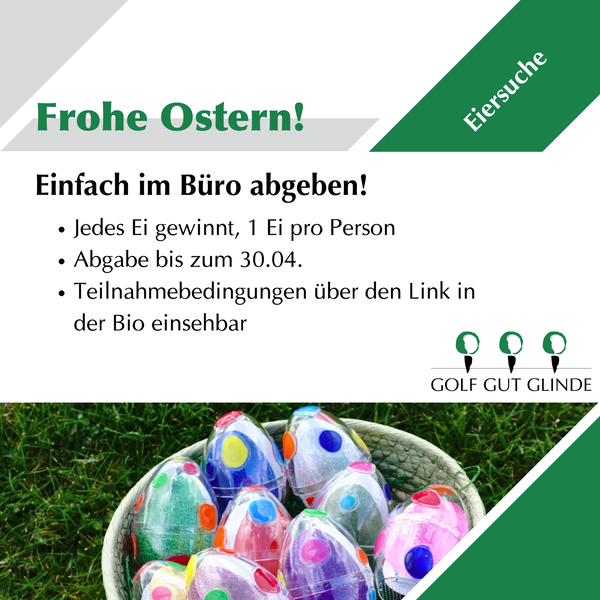 Nutzen Sie die Gelegenheit, auf Entdeckungstour zu gehen und die versteckten Ostereier zu finden. Jedes Osterei bietet Ihnen die Chance auf attraktive Preise, die Sie im Golfbüro einlösen können.