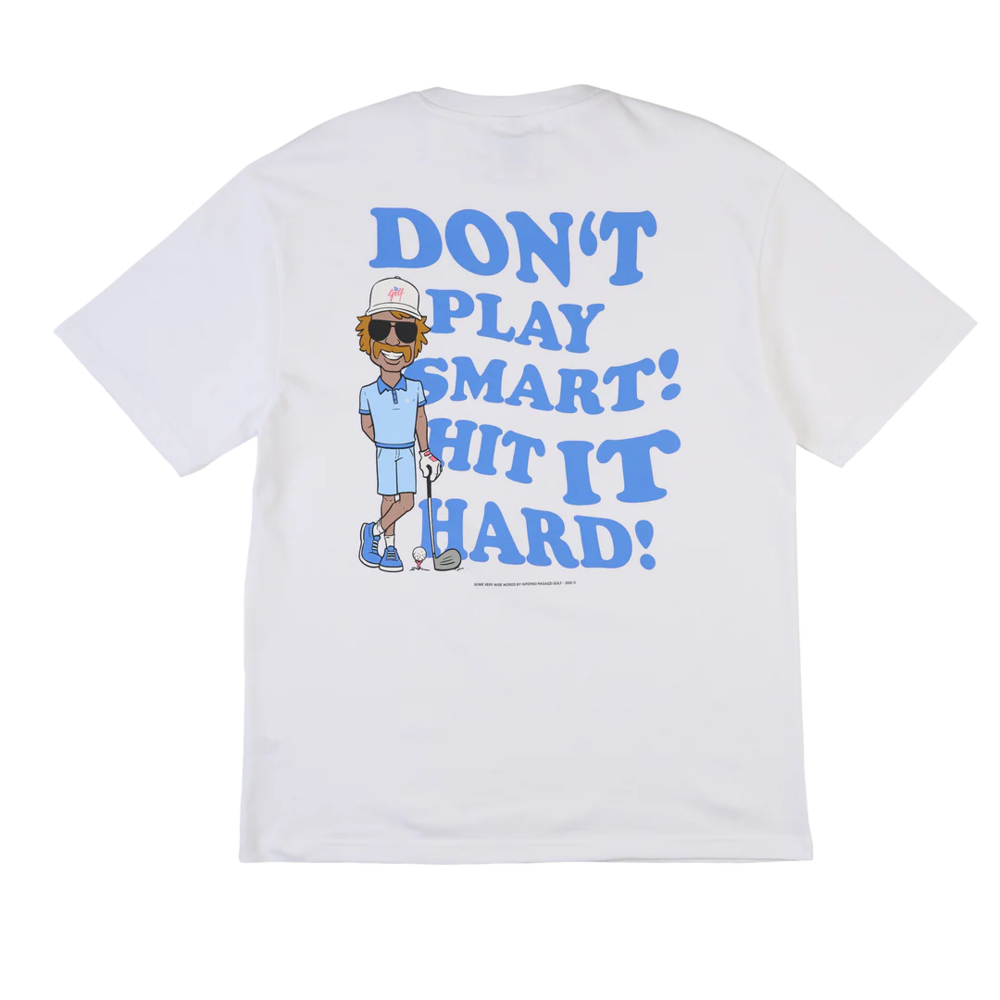 Ein Shirt wie dein Drive: kompromisslos: Par 5, scharf rechts rum - über Bäume, Wasser, Berge und den Supermarktparkplatz. Safe übers fairway? No. Don’t Play Smart - Hit it hard. Alles ignorieren, alles überfliegen - direkt zur Fahne, als wär’s nix. Smack It – für alle, die nicht spielen, sondern angreifen.